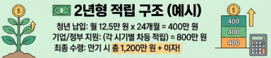 - 청년 적립: 청년 본인은 24개월 동안 매달 1,250만 원을 적립합니다. (총 400만 원)